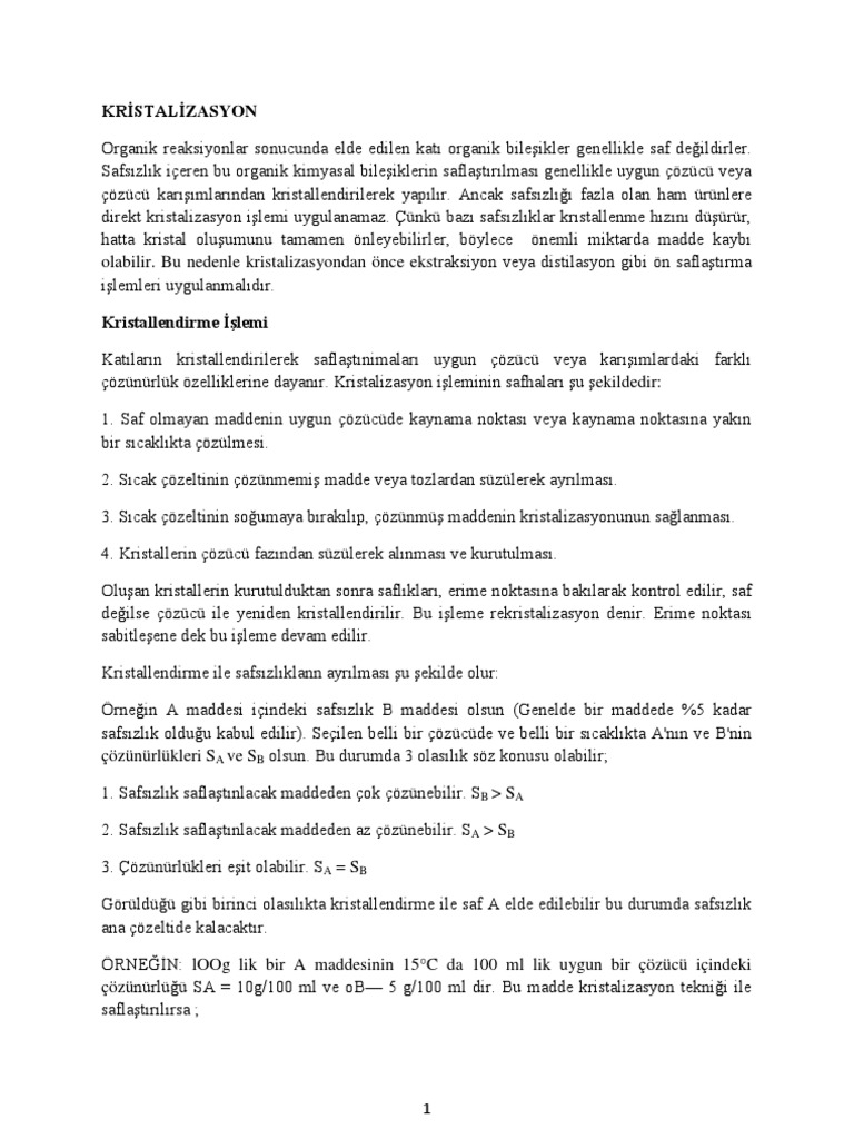 Benzer yapıdaki bileşiklerin birbirini çözebilecekleri bilinmektedir. Kristallendirme için gerekli olan uygun çözücünün bulunması bazen çok zor olabilir. Kristallendirme için gerekli olan uygun çözücünün bulunması bazen çok zor olabilir. O yüzden iki katı ikisininde çözüldüğü sıvıya Damıtma, kristallendirme, çözme, yumuşatma, süblimleştirme, mayalandırma gibi işlemleri geliştirmişlerdir. Yapılan bu işlemlerin kimya biliminin gelişmesine katkısı olmuştur. Sıcaklığın düşmesiyle çözünürlüğü azalan maddenin düzgün geometrik şekilli katı parçalar halinde çöktürülmesine kristallendirme denir. Sabit faza karşı hareketli bir fazdan yararlanarak bir karışımdan bir bileşiği ayırma tekniğidir. Katı maddenin uygun çözücüde çözülüp soğutulması ile kristaller meydana gelir. Karışımdaki iki bileşen de suda çözündüğünden, bileşenlerin farklı çözünürlüklere sahip olmalarından yararlanılarak uygulanan ayırma tekniğidir. Dilediğiniz şekilleri yaparak onları kri. Katı maddenin uygun çözücüde çözülüp soğutulması ile kristaller meydana gelir. Kristallendirme kimyacılar için en önemli konulardan birisidir.olarak kristallendirme bu videoda çok iyi gösterilmiş.